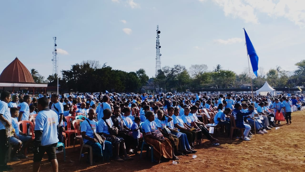 SOE, TIMES Nusa Tenggara Timur| Sebanyak 4000 relawan yang tergabung dari Yayasan Tunas Muda Indonesia (YTMI) dan Pro Jokowi atau Projo ikut hadir dalam deklarasi akbar Calon Gunernur Melki Laka Lena dan Johni Asadoma di Lapangan Puspenmas SoE Senin 16 September siang.