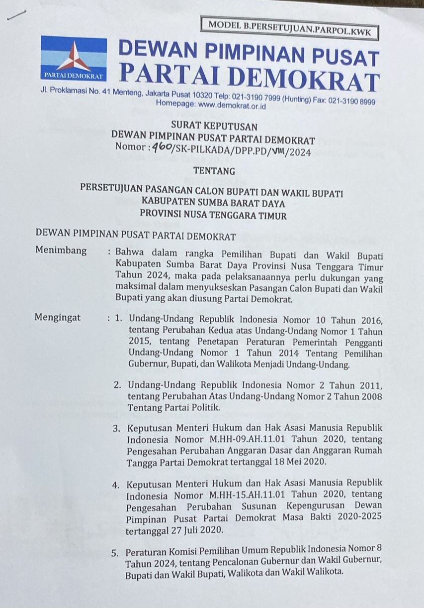 Penyerahan SK tersebut berlangsung di Jakarta dan disaksikan langsung oleh Ketua DPD Partai Demokrat Nusa Tenggara Timur (NTT), Leonardus Lelo, serta Ketua DPC Partai Demokrat SBD, Jhon Ngongo Deta.