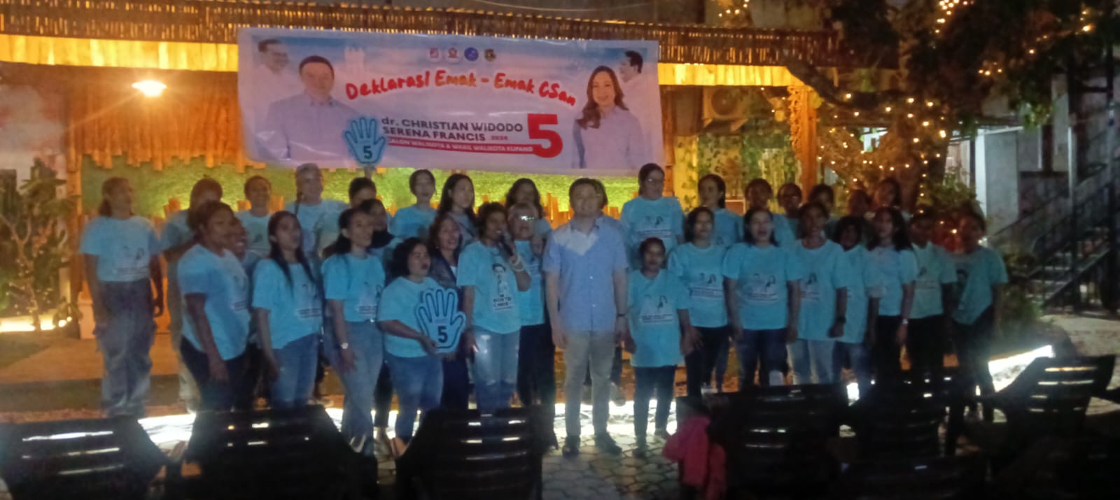 KUPANG, TIMES Nusa Tenggara Timur| Emak-emak perwakilan dari sebanyak 51 Kelurahan di Kota Kupang deklarasi bersama mendukung Paslon Nomor Urut 5 dr. Christian Widodo-Serena Francis di Pilkada Kota Kupang, Kamis 26/09 malam.