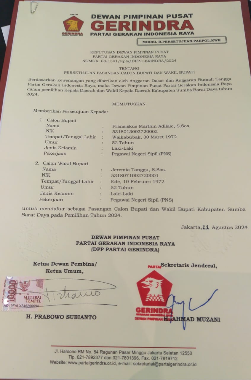 KUPANG, TIMES Nusa Tenggara Timur| Setelah melalui penantian panjang, Partai Gerindra akhirnya menetapkan dukungannya kepada pasangan Fransiskus Marthin Adi Lalo dan Yeremia Tanggu (Paket Rakyat) dalam Pemilihan Kepala Daerah (Pilkada) Sumba Barat Daya 2024.