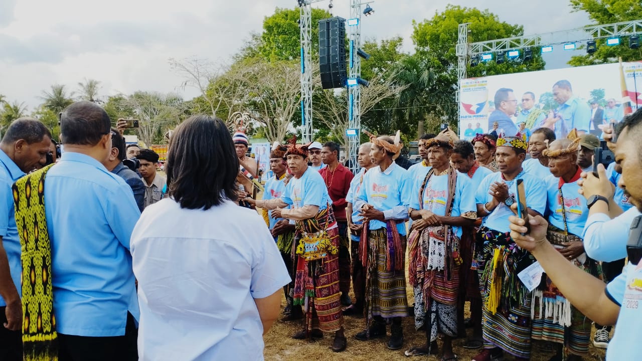 Pasangan Calon Gubernur dan Wakil Gubernur NTT, Melki Laka Lena dan Johni Asadoma tiba dilapangan diantar tarian cakalele san disambut oleh tutur adat Natoni oleh belasan tokoh adat yang mengenakan pakaiam adat Timor Tengah Selatan.