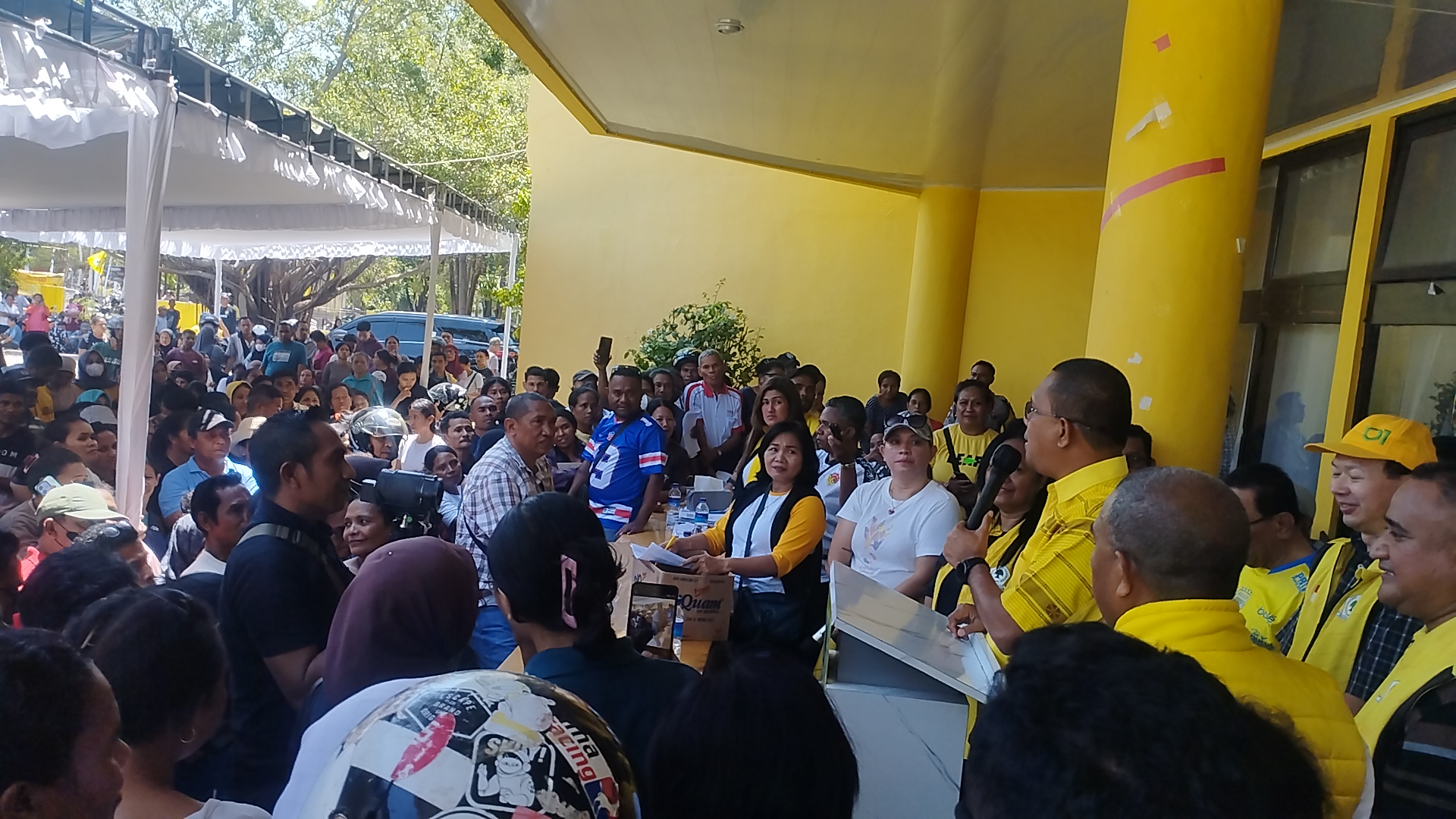 Gubernur NTT, Melki Laka Lena yang juga Ketua DPD I Partai Golkar NTT juga ikut hadir langsung saat pembagian paket sembako murah.