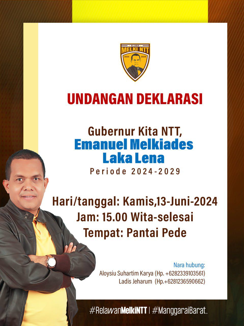 “Kami mengundang masyarakat yang memiliki kesamaan visi dengan Relawan Melki NTT, untuk hadir di Pantai Pede, Labuan Bajo, Kamis besok Pukul 15.00 sampai selesai. Deklarasi ini akan dimeriahkan dengan hiburan musik serta game menarik,” ajak Aloysius.