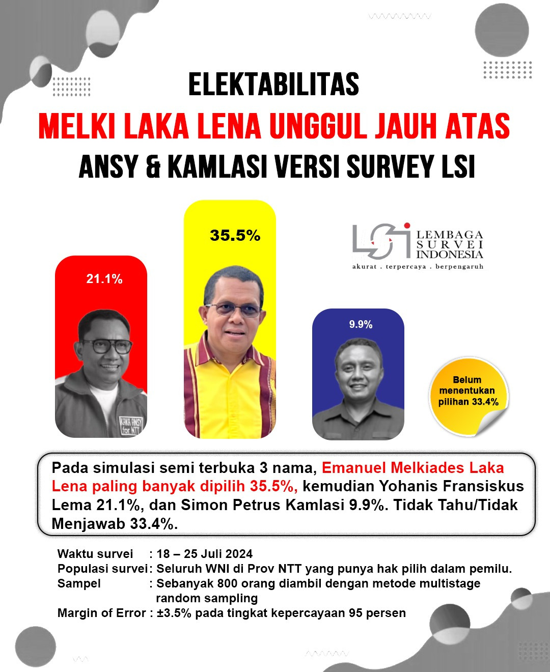 Survei LSI merilis Melki Laka Lena unggul dalam simulasi tiga nama dengan elektabilitas 35,5 persen, unggul jauh dari Yohanis Fransiskus Lema 21,1 persen dan Simon Petrus Kamlasi 9,9 persen.