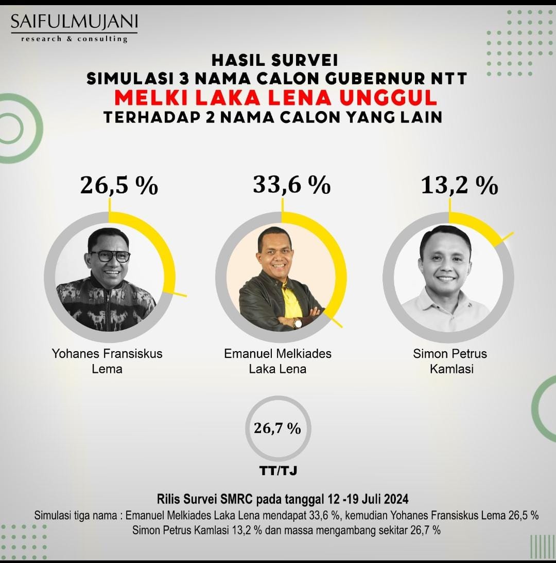 KUPANG, TIMES Nusa Tenggara Timur| Lembaga survey SMRC baru saja menyelesakian survei. Rilisnya menunjukan, calon Gubernur NTT Eamanuel Melkiades Laka Lena ketika diduetkan dengan Jane Natalia Suryanto atau Gabriel Beri Bina, pasangan ini tetap mengungguli kandidat lain.