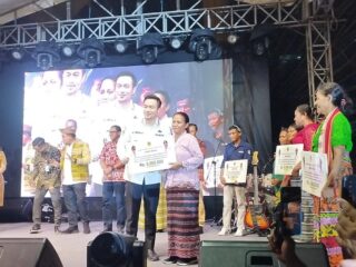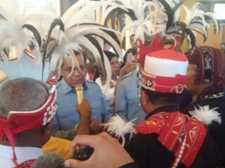 Sebagaimana tradisi orang Alor Johni Asadoma bersama Rombongan dan partai pengusung di sambut tarian caka lele.